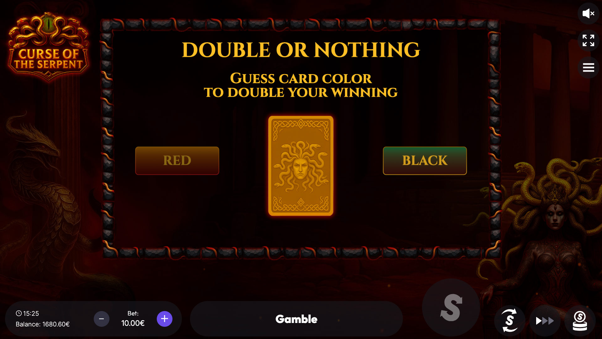 After Free Spins, players may choose to risk it all in a fast-paced 50/50 gamble feature. Pick the color of the next card—red or black—for a chance to double your winnings up to 4 times in a row. Dare to test your luck?
