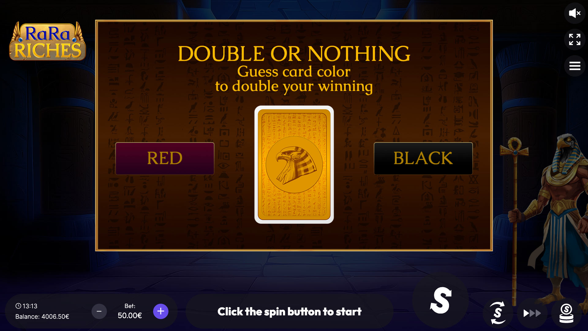 After the Free Spins conclude, players may challenge fate through the Double or Nothing gamble feature. Like choosing between two sacred paths, players must guess whether the next card will be red or black — a 50/50 test of intuition and bravery.