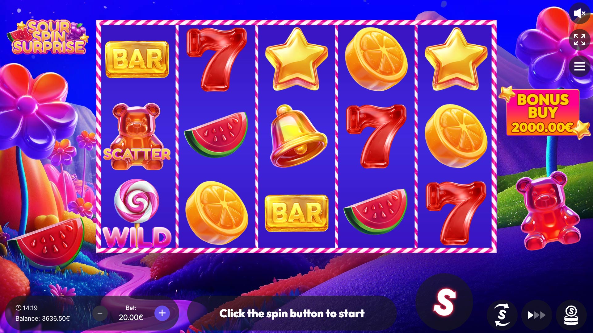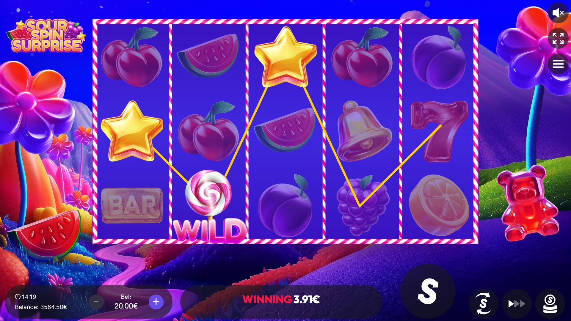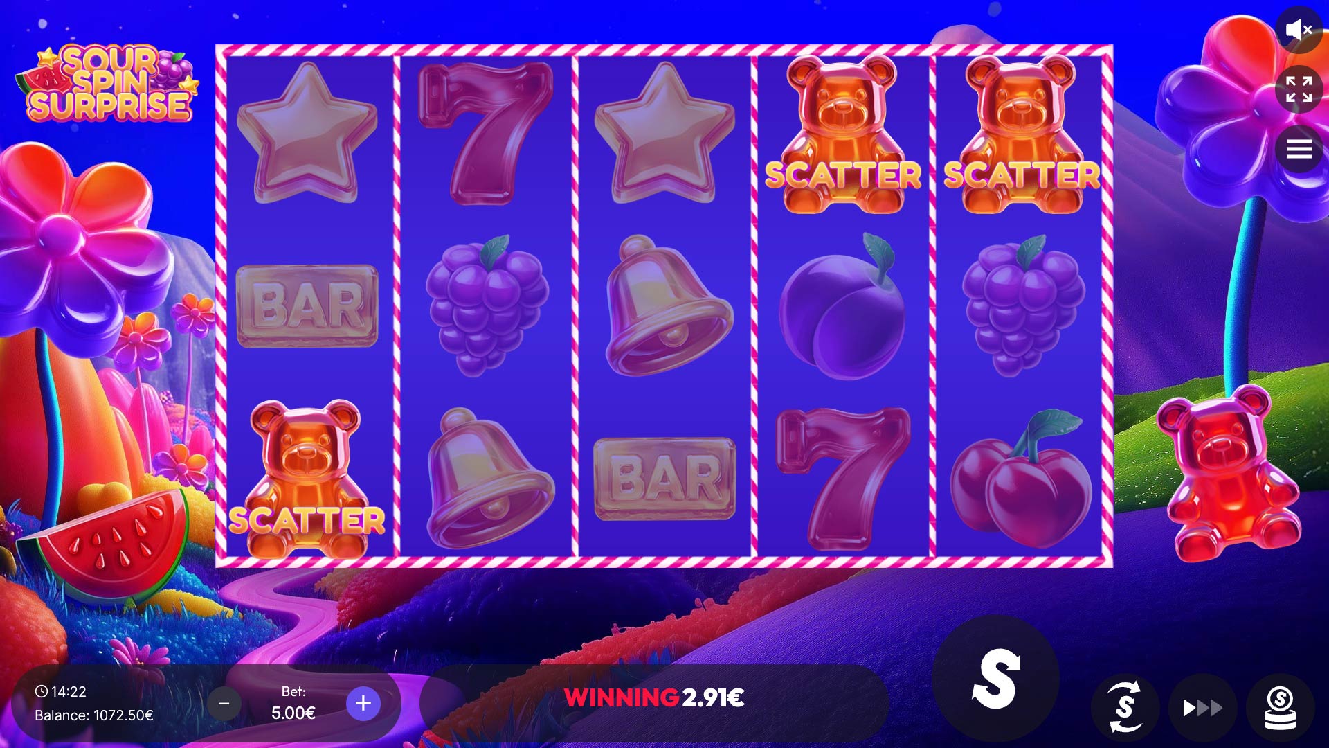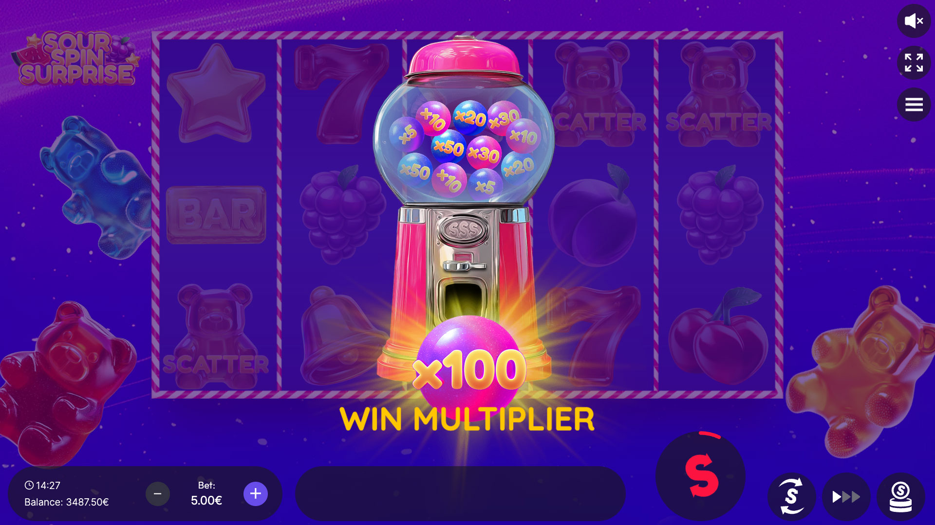 Sour Spin Surprise takes you into a vibrant candyland bursting with sweet wins and sour twists! This colorful 5×3 slot with up to 25 paylines features WILDs to boost your combinations and SCATTER-triggered Free Spins with unlimited retriggers. Before Free Spins begin, the exciting Candy machine spins to award a global multiplier of up to ×100, supercharging every reward. And for those craving even more thrill, the Double or Nothing gamble feature lets you guess sweet or sour for the chance to double your winnings up to four times in a row. Get ready for a sugar rush of fun, flavor, and fantastic prizes!